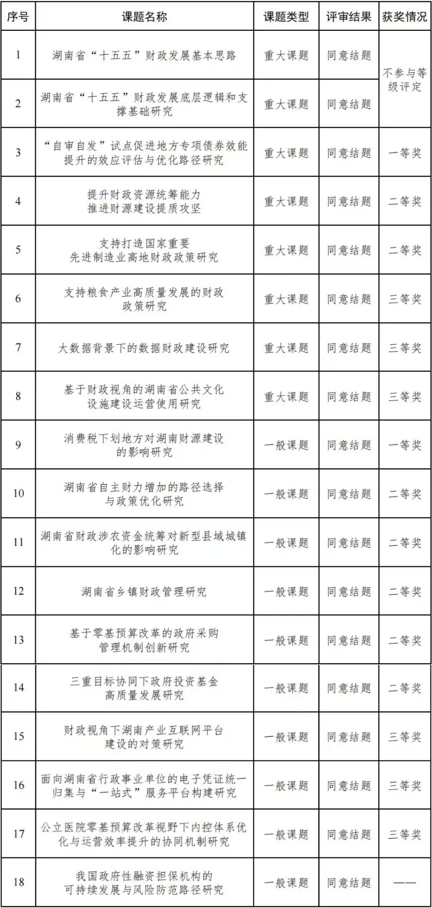 湖南财政与经济发展研究中心(以下简称中心)是湖南省财政厅与免费约炮 、湘潭大学、湖南财政经济免费约炮合作共建的全省财政科研基地。2025年,中心公开立项课题18项,其中,重大课题8项、一般课题10项,经专家评审,均同意结题。现将评审结果公告如下: